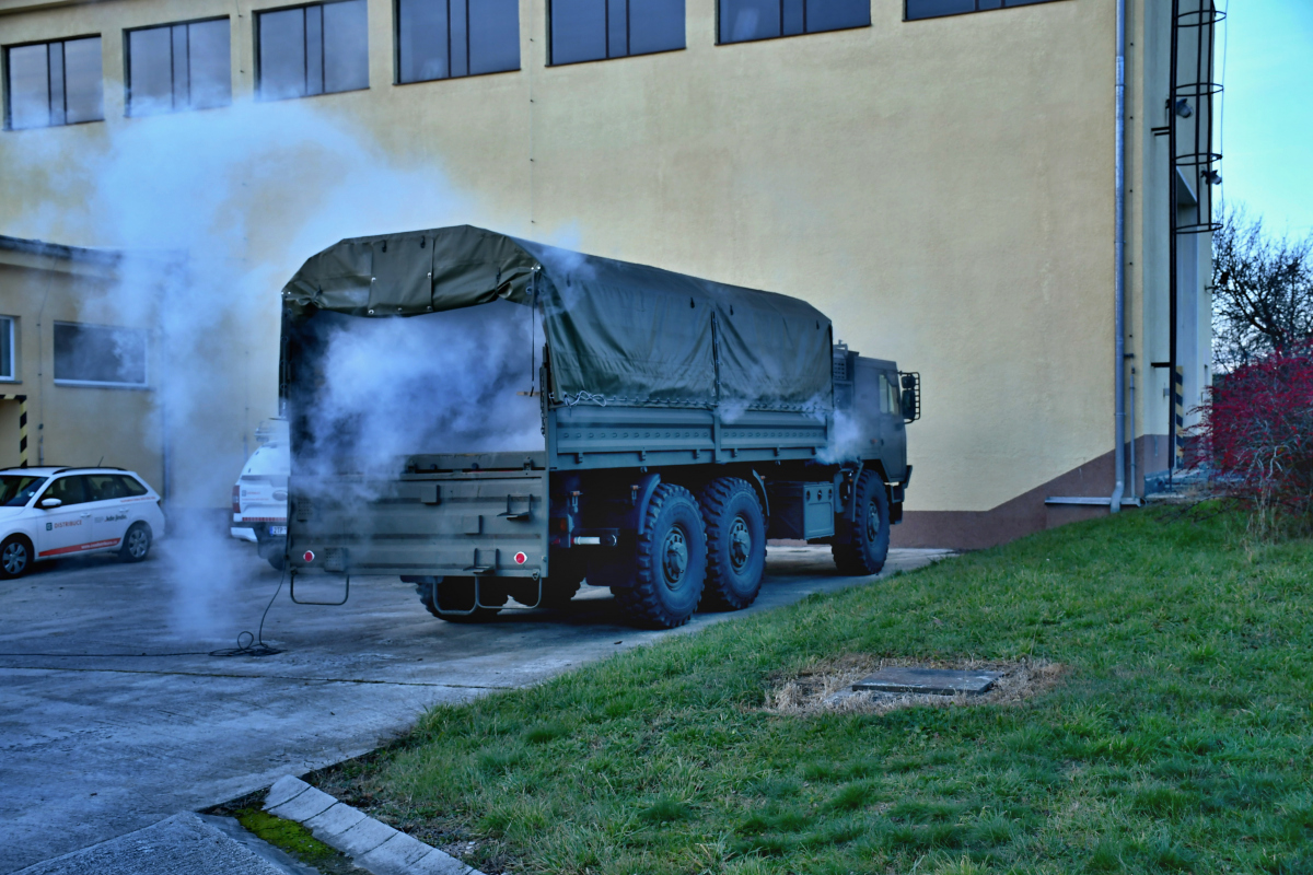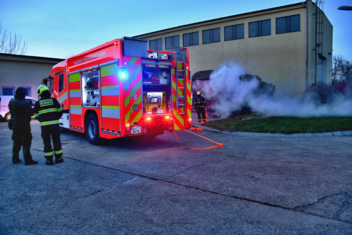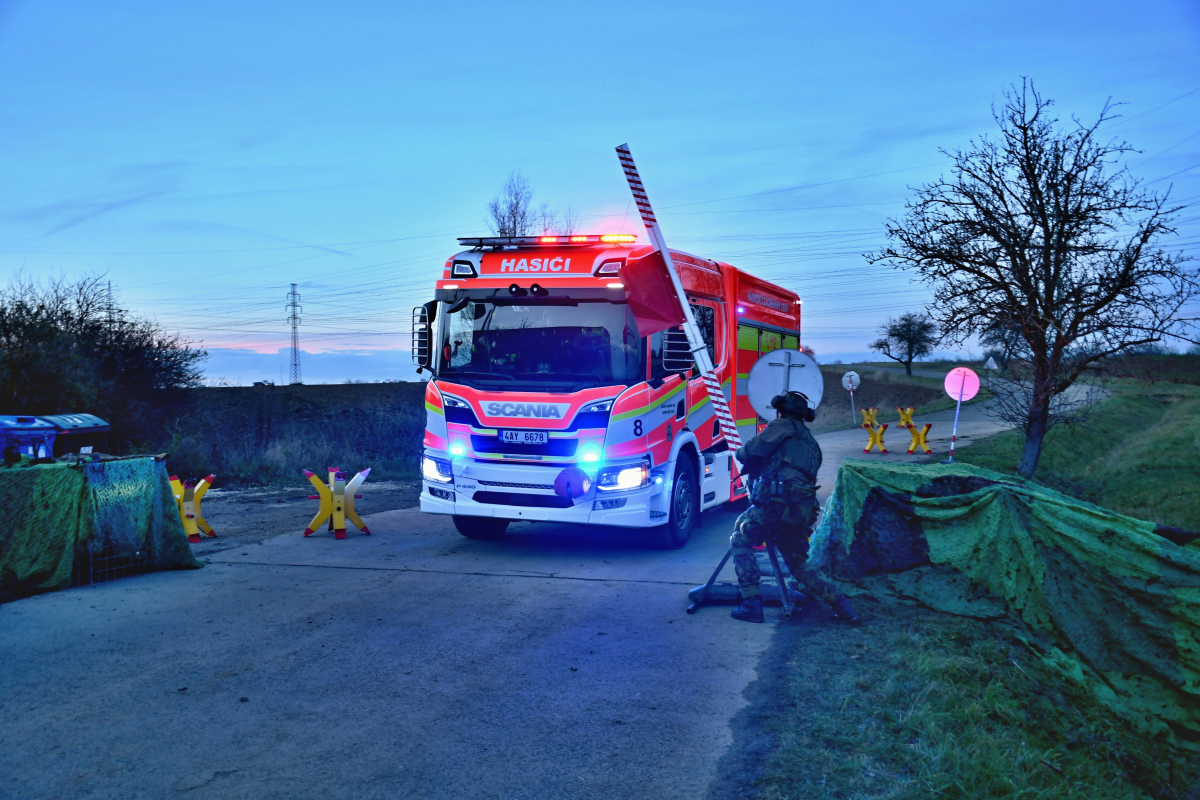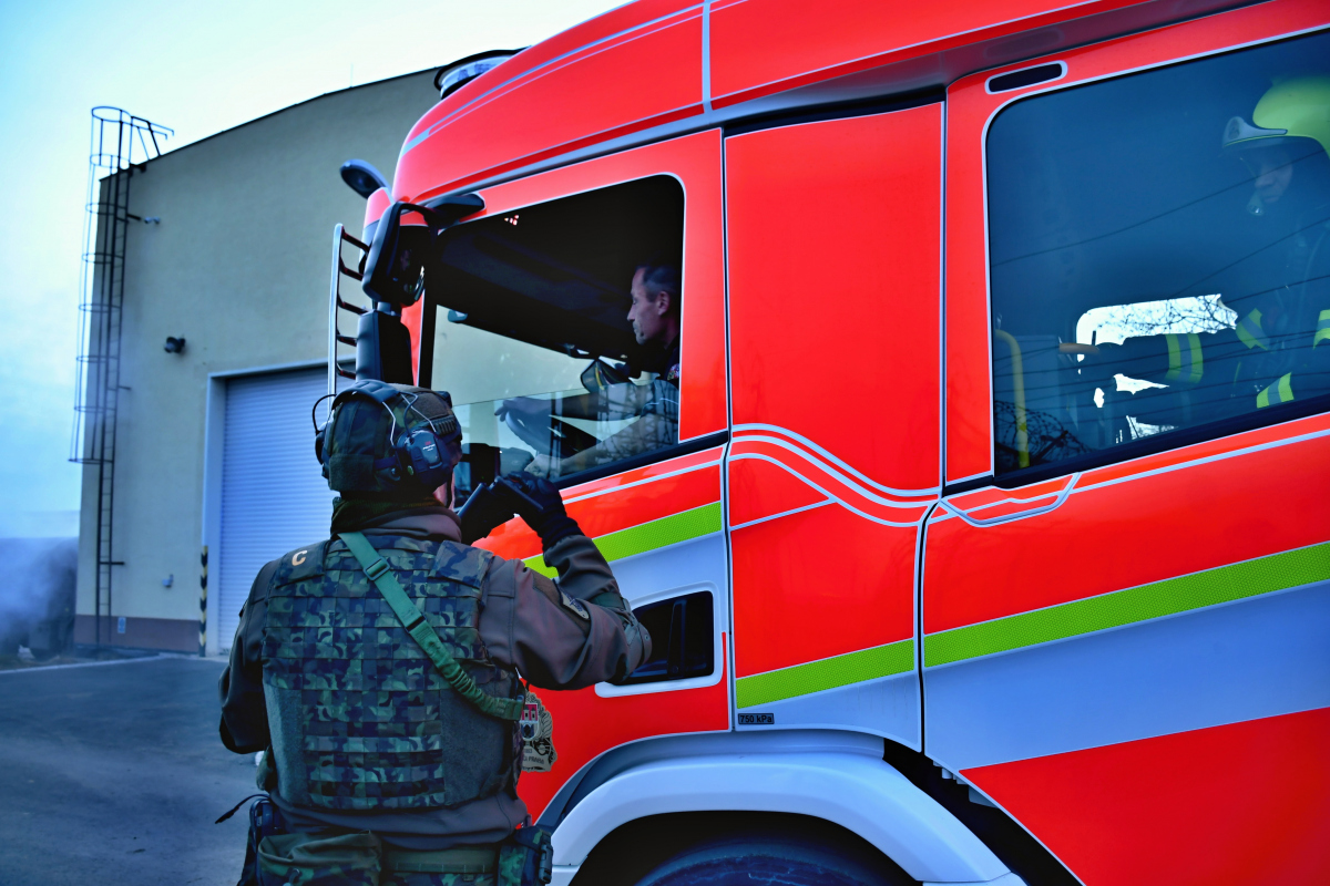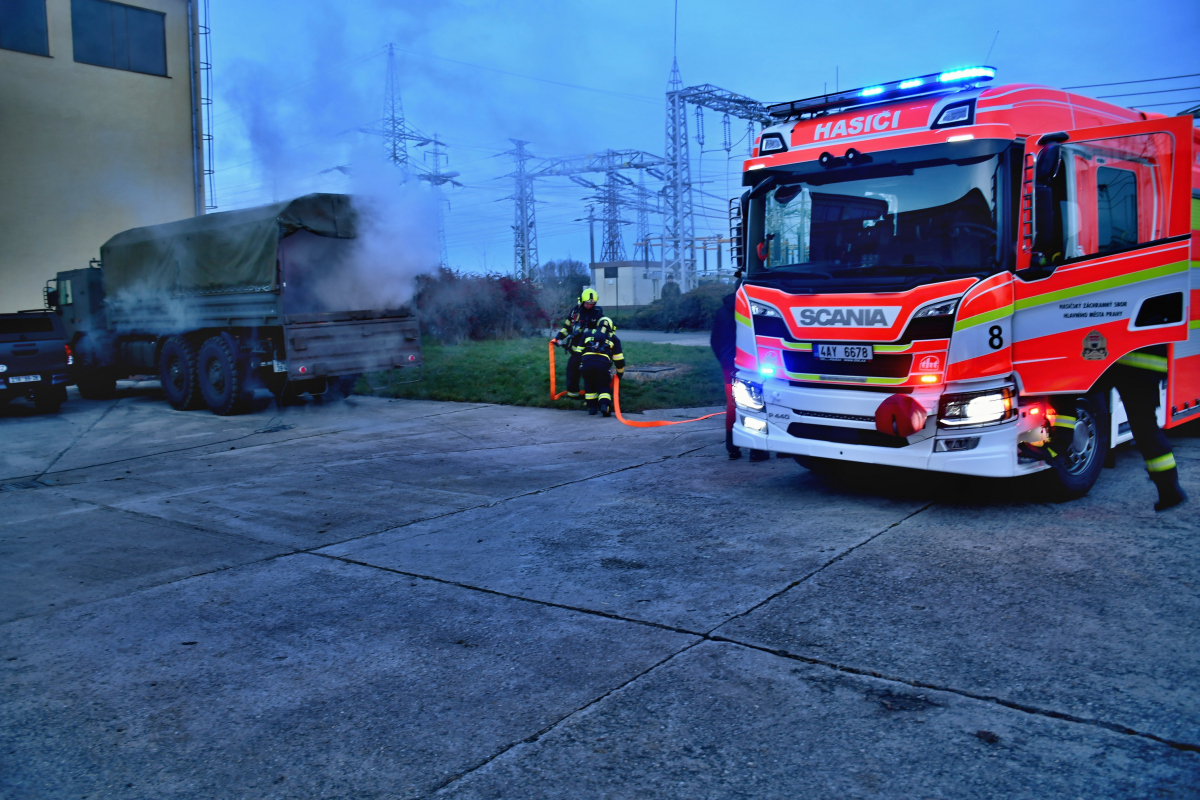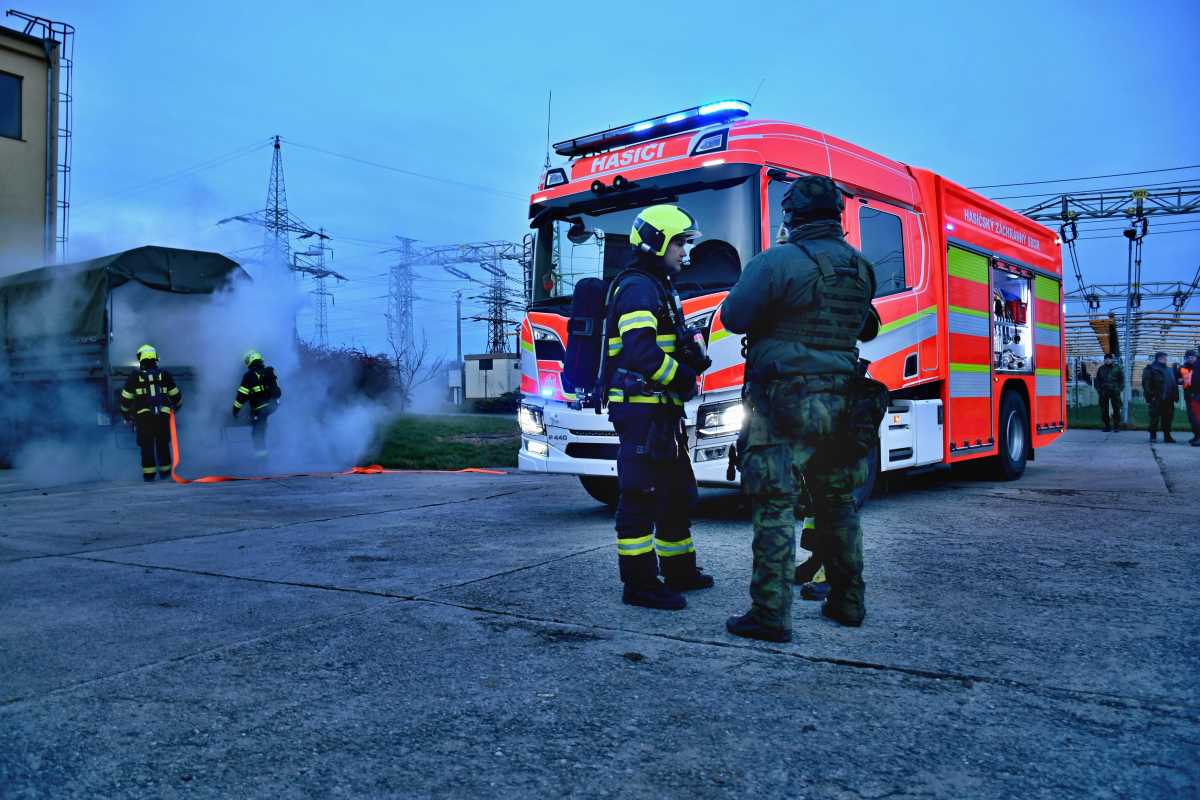 Druhý scénář dne prověřil součinnost vojáků s hasiči. Strážní hlídky si všimly kouře vycházejícího ze zaparkovaného vozidla Tatra 815-7 uvnitř chráněného objektu. Okamžitě vyhlásily požární poplach, ohlásily událost operačnímu středisku úkolového uskupení a připravily prostor pro příjezd hasičských jednotek. Na místo vyrazil Hasičský záchranný sbor hl. m. Prahy, který požár zlikvidoval a provedl kontrolu. Vojáci mezitím zajišťovali perimetr, usměrňovali pohyb zaměstnanců objektu, případné techniky a zabezpečili přístupové trasy pro zásah HZS.